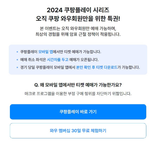 ◇ 매크로 프로그램을 이용한 부정구매 방식을 차단하기 위해서 오직 티켓 예매는 쿠팡플레이 모바일에서만 가능합니다.