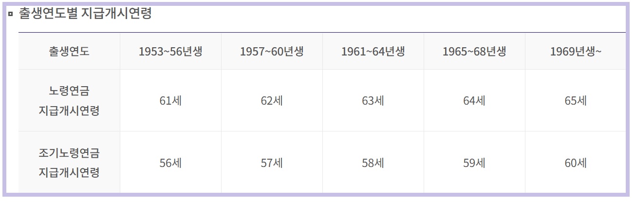 ✔ 연령 : 출생년도에 따라 조기수령 시기가 다릅니다.