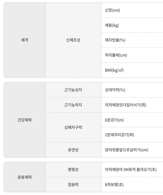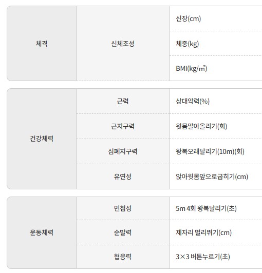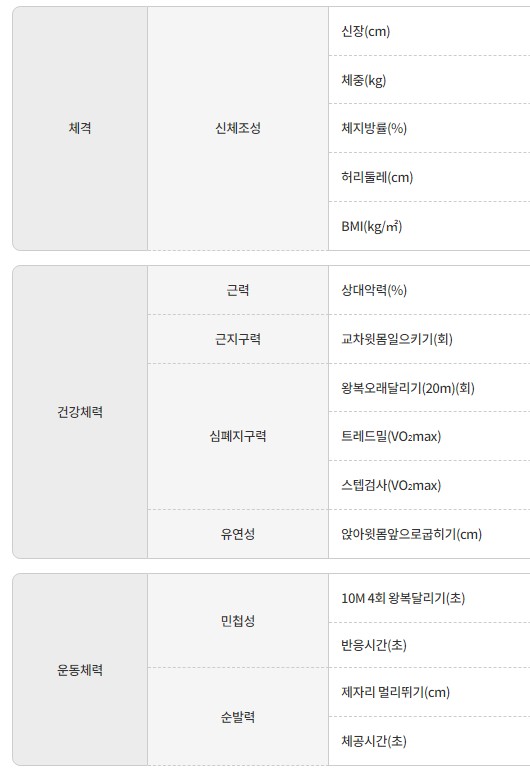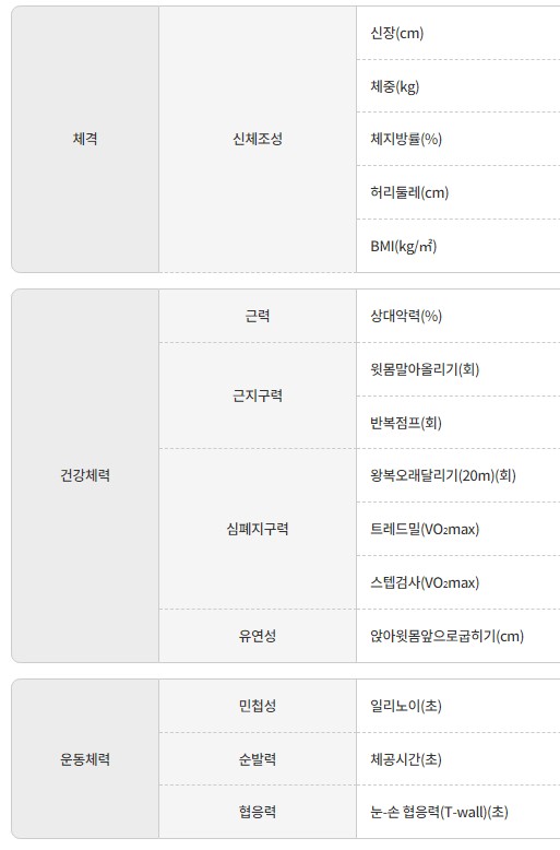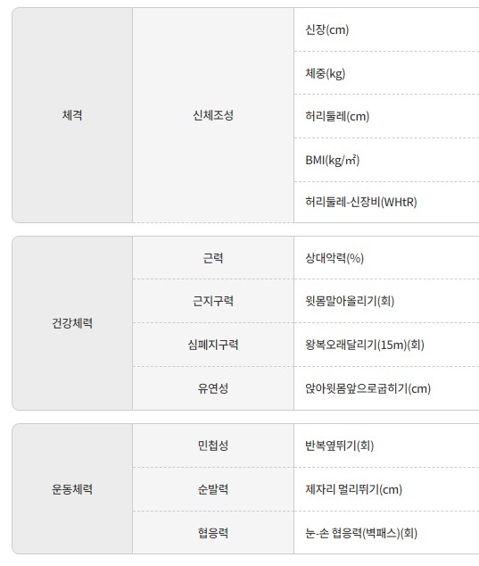 나이별로 체력을 측정하는 종목들은 아래와 같습니다.