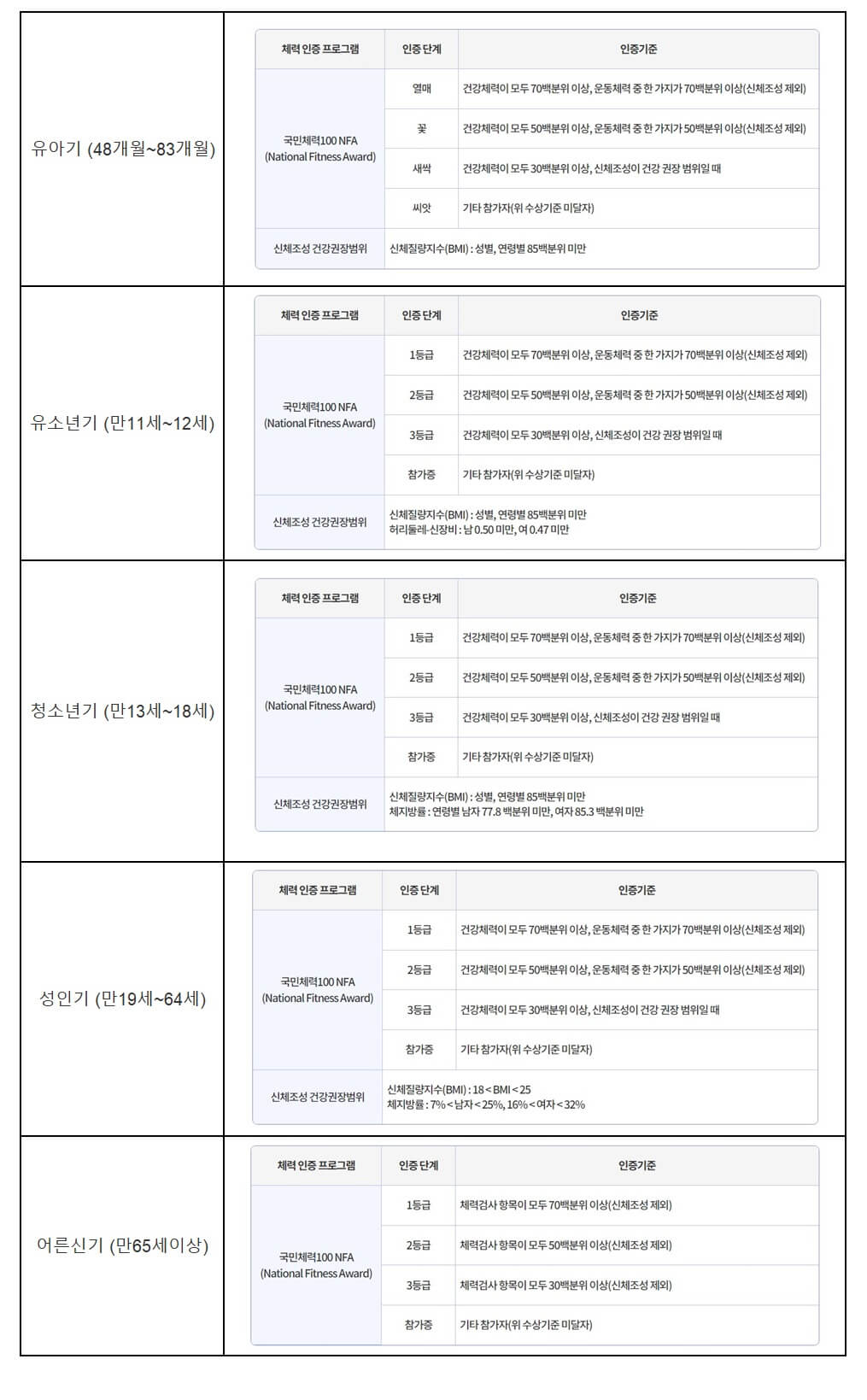 성별, 연령별로 인증단계 및 인증 기준은 아래와 같습니다.