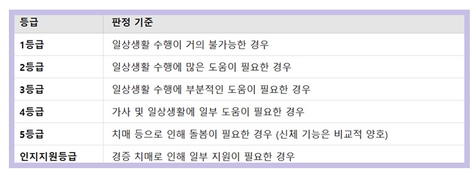 장기요양등급은 신청자의 신체적·정신적 기능 저하 정도에 따라 6가지 등급으로 나뉩니다.