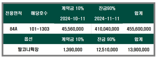 분양가격이 4억대 중반이며 계약금 10%와 잔금 90%로 진행됩니다.