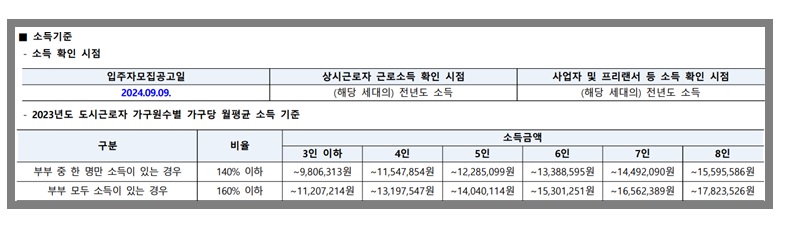 아래의 소득기준과 자산기준을 꼭 확인하시고 청약하시기 바랍니다.