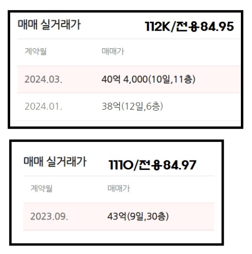 실거래가는 2024년에 40억 4천으로 거래 내역이 있습니다. 2023년에는 43억의 실거래 내역도 있습니다.