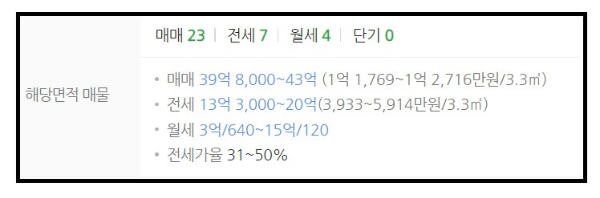 매매 호가는 39억 8천에서 43억까지 구성되어 있으며, 전세가는 18억~ 20억 수준으로 되어 있는데 한집이 13억 3천으로 올라온 게 있습니다. 분양가 19억대인데 전세호가가 18억에서 20억 수준이니 전세금으로 잔금 해결도 가능합니다.