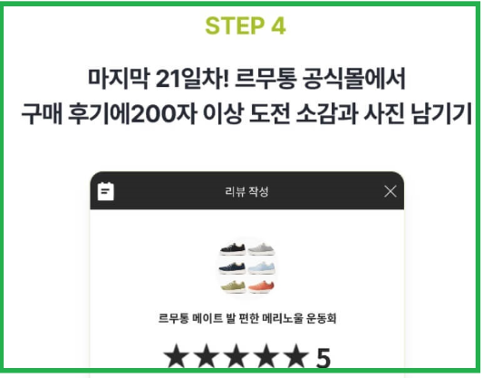 21일 동안 열심히 산책하면서 사진을 찍어서 올리면 되고 21일간 완료하면 르무통 공식홈에 구매후기와 도전소감을 200자 정도 남기라고 하네요. 구매후기는 이미 제품 받았을 때 올렸는데 이건 다른 건지... 21일 이후에 다시 시도해 보겠습니다.