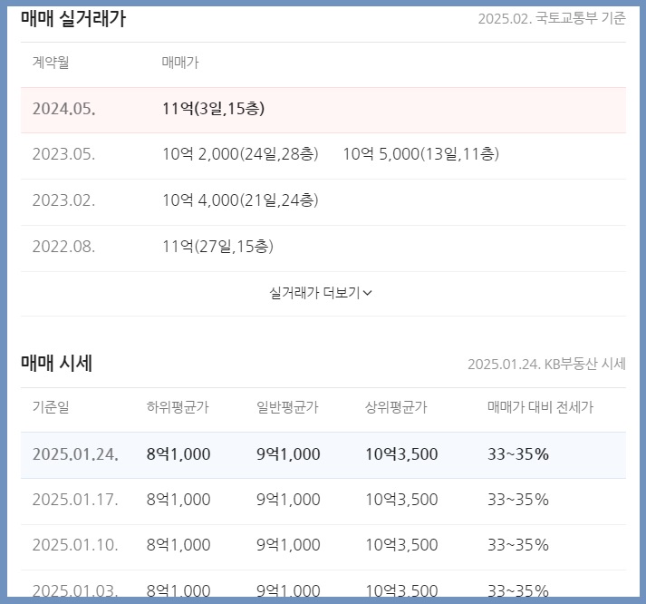 105B 타입은 실거래가 11억이지만 2024년 5월 거래이고 그 이후 다른 타입이 2024년 12월에 8억대로 거래된 게 있습니다. 최근 부동산 상황을 볼 때 8억대로 본다면 안전마진은 4억 정도 예측해 봅니다.