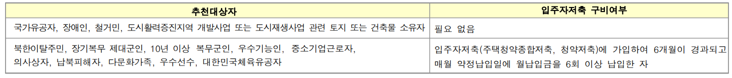 - 입주자저축(주택청약종합저축, 청약저축)에 가입하여 6개월이 경과되고 매월 약정납입일에 월납입금을 6회 이상 납입한 분