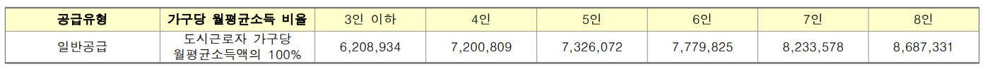 - 무주택세대구성원 전원의 월평균소득 합이 전년도 도시근로자 가구당 월평균소득 기준(태아를 포함한 가구원수가 4인 이상인 세대는 가구원수별 가구당 월평균소득을 말함)의 100% 이하인 분