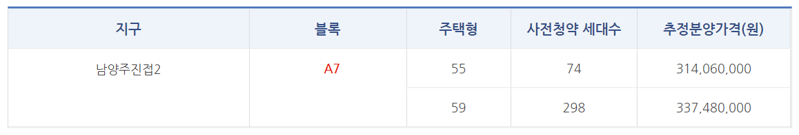 사전청약 세대수와 추정분양가격입니다.