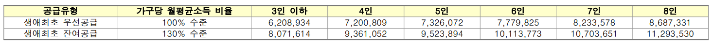 - 무주택세대구성원 전원의 월평균소득 합이 전년도 도시근로자 가구당 월평균소득 기준(태아를 포함한 가구원수가 4인 이상인 세대는 가구원수별 가구당 월평균소득을 말함)의 100% 이하인 분