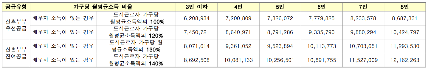 - 무주택세대구성원 전원(예비신혼부부의 경우 ‘혼인으로 구성될 세대’의 세대구성원 전원)의 월평균소득 합이 전년도 도시근로자 가구당 월평균소득 기준의 130% (단, 배우자가 소득이 있는 경우에는 140%) 이하인 분