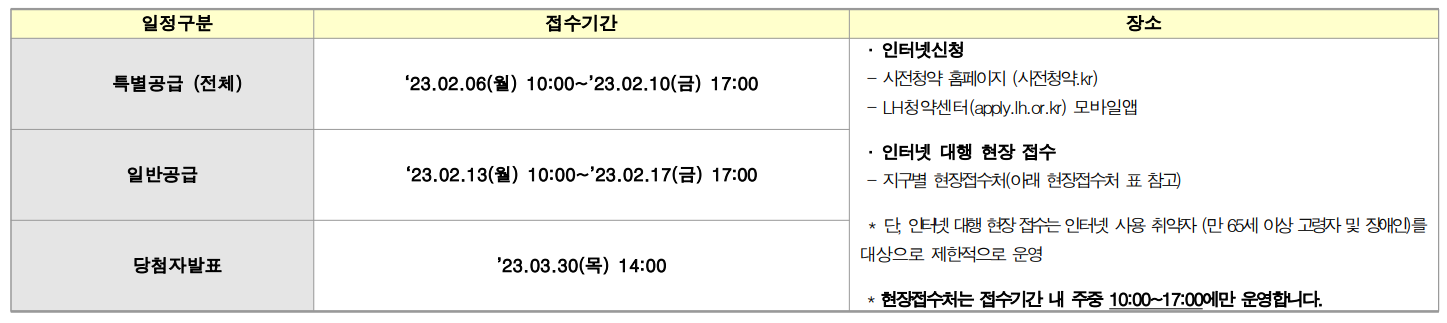 - 해당 기관에서 특별공급대상자로 선정․통보되었다 하더라도 반드시 해당 신청일(2023.02.06~02.10)에 사전청약 홈페이지(사전청약.kr) 또는 LH청약센터 모바일앱을 통해 청약 신청하여야 합니다.