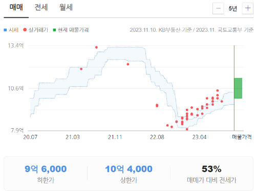 실거래가는 9억 6천에서 10억 4천 사이입니다.