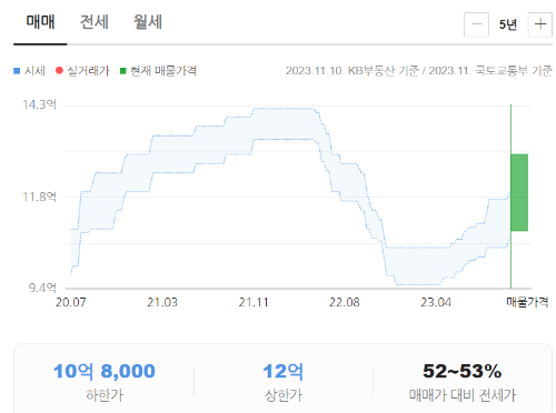84 기준으로 최저 10억 9500에서 최대 13억으로 호가 형성되어 있습니다.