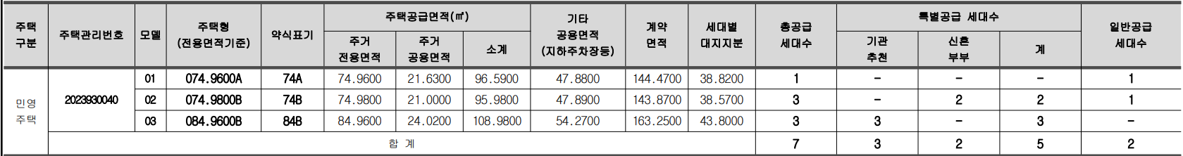 특별공급 5세대와 일반공급 2세대로 구성되며 총 7세대입니다.