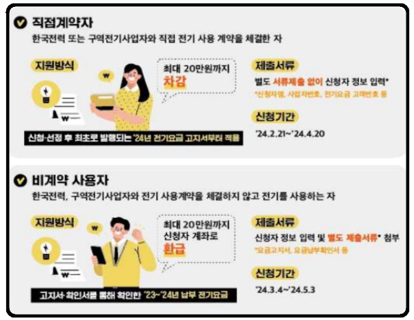 한전과 직접계약자는 최대 20만 원까지 전기요금을 차감해주는 방식이며 비계약 사용자는 최대 20만원까지 신청자 계좌로 환급이 되는 방식입니다.