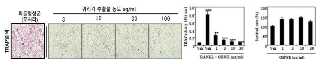 - 귀리껍질 물 추출물을 3, 10, 30, 100㎍/㎖ 처리했을 때 3㎍/㎖의 낮은 농도에서도 80% 이상의 파골세포 활성 억제 효과