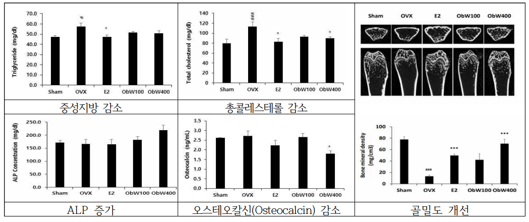 - 귀리껍질 물 추출물 (400㎎/㎏) 투여한 집단의 골밀도가 90.6% 높아져 골다공증 개선효과가 우수함을 확인