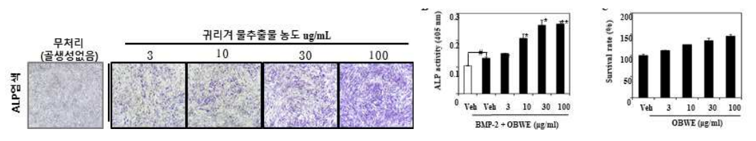 조골 전구세포인 C2C12 세포에 조골세포 분화 유도 사이토카인인 BMP-2를 처리해 분화를 유도하고 분화 관련 분자마커인 ALP를 분석