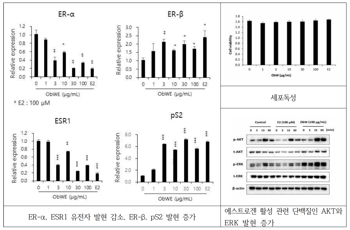 → 귀리껍질이 에스트로겐과 유사하게 에스트로겐 신호전달 관련 단백질(p-AKT, 귀리껍질 p-ERK) 발현을 촉진하기 때문으로 분석 (에스트로겐 수용체 알파(ER-α)가 지나치게 증가할 경우에 유방암을 유발함)