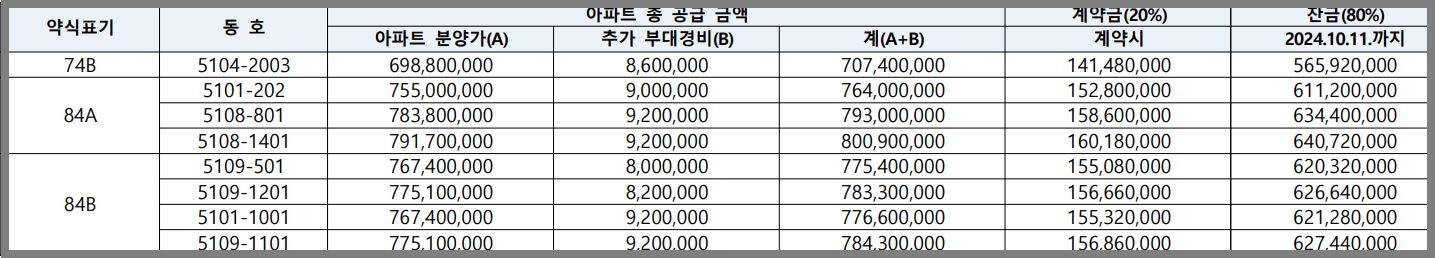 74A는 7억대, 84A와 84B는 7억 후반, 8억 초반까지 공급금액이 구성되어 있습니다.
