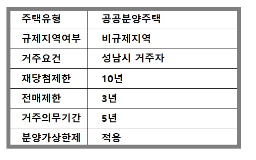 성남시에 거주하는 무주택 세대 구성원이면 청약이 가능하고, 재당첨제한은 10년, 전매제한 3년과 거주의무기간 5년이 있으니 참고하시기 바랍니다.