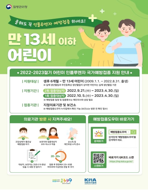 | 생후 6개월 ∼ 만13세 어린이 (2009.1.1∼2022.8.31 출생) | 2회 접종 대상자 | 2022년 9월 21일 ∼ 2023년 4월 30일 |