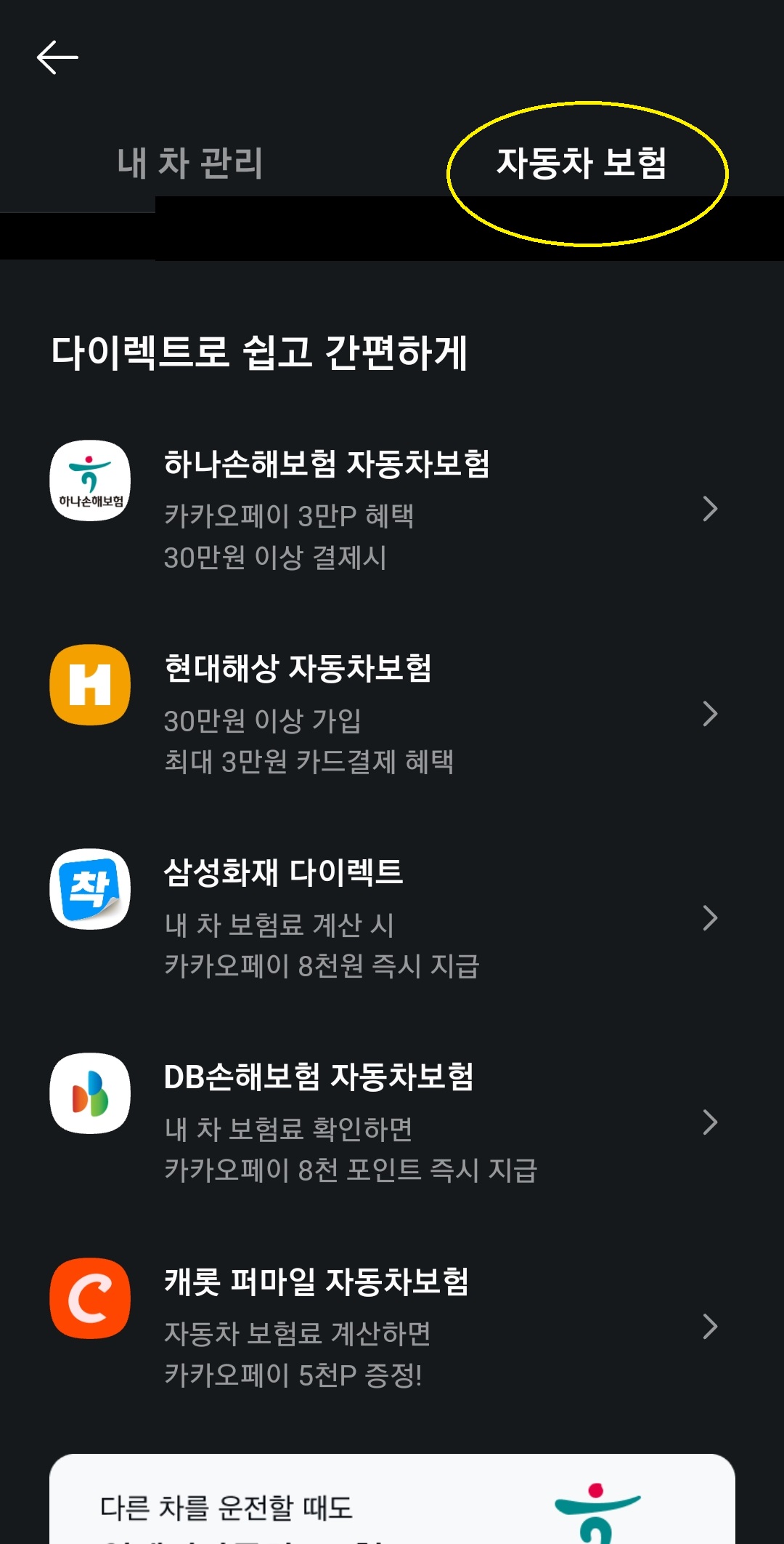 오른쪽 아래에 삼색 줄선을 누르면 자동차 보험 페이지로 이동합니다.
