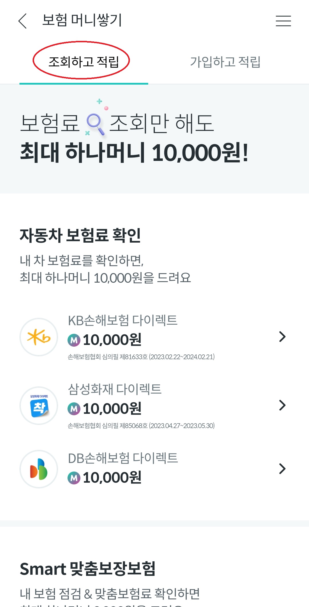 여기에서도 '조회하고 적립' / '가입하고 적립' 두 가지 이벤트가 있으니 확인하세요.