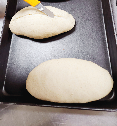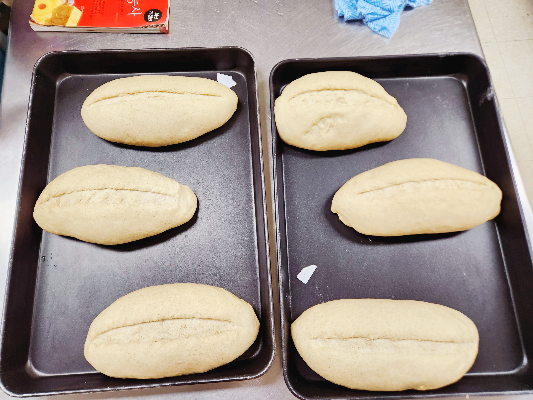 발효실(온도 32~35도, 습도 85%)에서 발효 후 위에 가운데를 일자로 칼집을 내주고