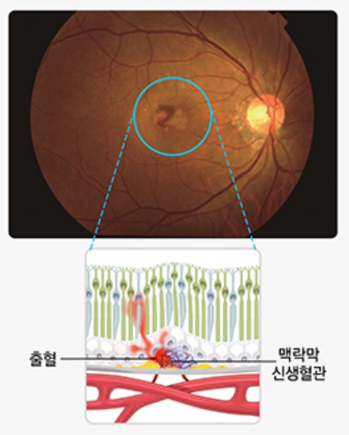 황반밑에서 비정상적인 혈관이 자라는 경우입니다. 이 비정상적인 혈관은 매우 약해서 터지기 쉬워 황반에 손상을 입히며 시력을 크게 저하시킵니다. 황반의 손실은 비교적 빠르게 일어나 중심시력이 급격히 나빠지며 실명을 초래하기도 합니다. |