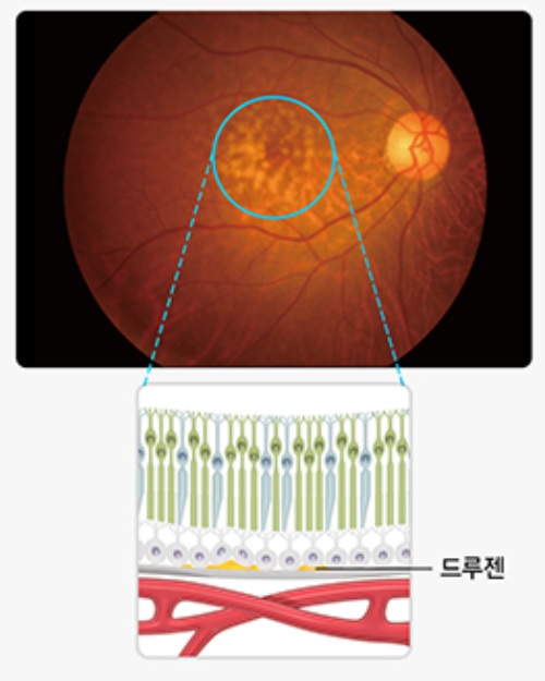 | 망막에 둥근 황갈색의 드루젠이라는 노폐물이 쌓여 망막이 위축되는 경우입니다. 시력저하가 크지 않아 별 증상없이 지내는 경우가 많으나 시간이 갈수록 황반의 기능이 떨어지며 시력저하가 나타납니다. |