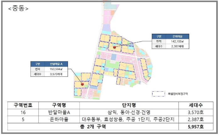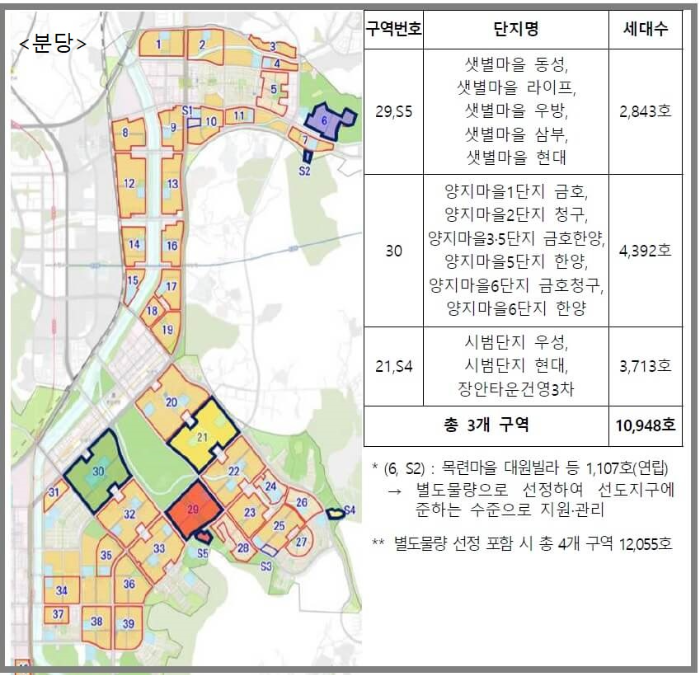2개 구역은 분당 목련마을 빌라단지로 1,107호와 일산 정발마을 2,3단지 262호입니다. 2개 구역이 포함된다면 분당은 모두 4개 구역으로 12,055호이며, 일산도 4개 구역으로 9,174호입니다. 평촌, 중동, 산본 신도시는 공모대상구역및 신 청구역중에 연립유형이 미포함되었습니다.