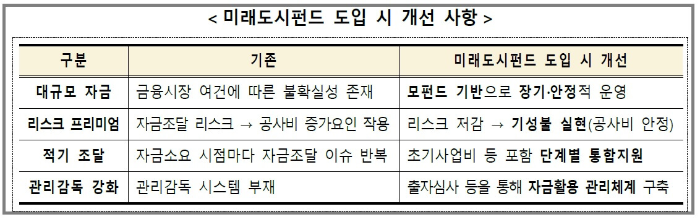 펀드를 통한 자금조달 지원 : 시공사의 자금조달 리스크를 낮춰 공사비를 저감 하고, 모펀드 출자 및 HUG보증으로 민간투자를 유치하고 시행자가 자펀드 자산운용사를 직접 경쟁입찰로 선정하여 운용사간에 경쟁으로 대출금리를 저감 하기 위한 12조 원 규모의 미래도시펀드 조성을 본격적으로 추진합니다.