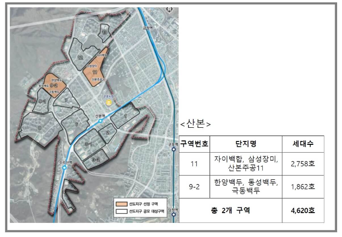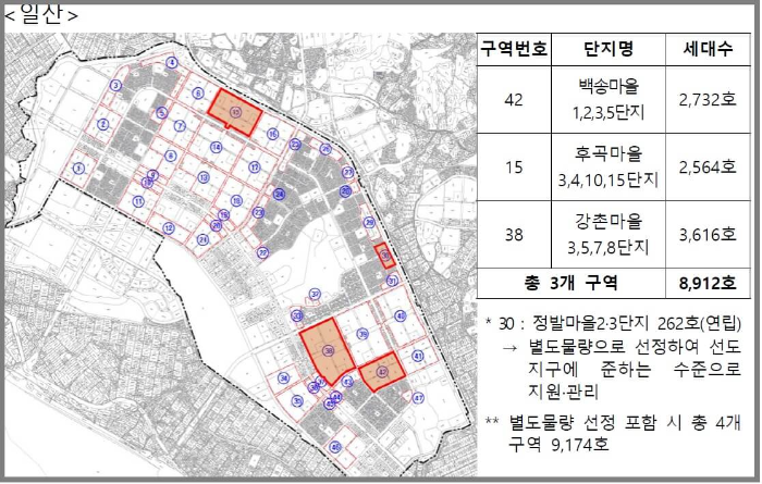 2개 구역은 분당 목련마을 빌라단지로 1,107호와 일산 정발마을 2,3단지 262호입니다. 2개 구역이 포함된다면 분당은 모두 4개 구역으로 12,055호이며, 일산도 4개 구역으로 9,174호입니다. 평촌, 중동, 산본 신도시는 공모대상구역및 신 청구역중에 연립유형이 미포함되었습니다.