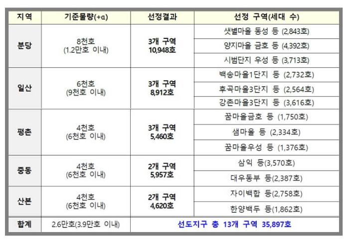 1기 신도시는 1980년대에 조성된 신도시로, 현재 많은 인구가 거주하고 있습니다. 이 지역은 노후화가 진행되고 있어 정비가 필요합니다. 선도지구는 총 13개 구역으로 총 3.6만 호 규모로 선정하였습니다. 선도지구로 선정되지 않은 구역 중에 주택의 유형이 연립인 2개 구역 1.4천 호는 별도로 정비물량으로 선정하여 선도지구에 준하는 수준으로 지원 및 관리를 하기로 하였습니다.
