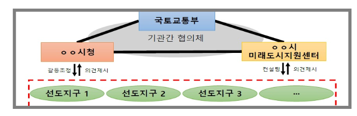 국토부는 국토부-지자체-주민-미래도시지원센터 간에 협력체를 구성하여 주민의견을 청취하고 사업공정을 관리하며 이슈 발생 시 즉시대응 등 통합정비에 관련된 일련의 과정을 체계적으로 지원합니다.