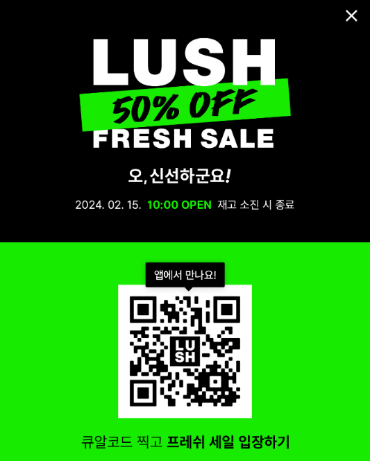 러쉬는 신선함을 대표적인 이념으로 삼고 있는 브랜드로 보다 신선한 제품을 보다 많은 고객에게 경험하게 한다는 글로벌 가이드에 따라 전 세계적으로 일 년에 단 한 번만 진행하는 이벤트입니다.