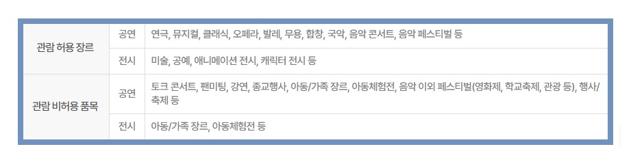 - 공연: 연극, 뮤지컬, 콘서트, 국악, 클래식, 오페라, 발레, 무용 등