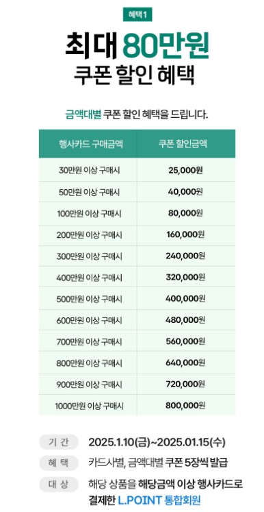 적게는 2만 5천원 쿠폰부터 많게는 최대 80만 원의 쿠폰 할인이 있으니 꼭 받아서 구매하시기 바랍니다.