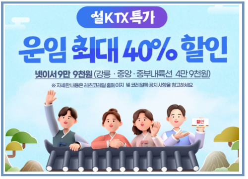 KTX는 이번 명절을 맞아 최대 40% 할인된 가격으로 기차표를 제공한다고 합니다. 특히 단체로 여행할 경우 더욱 저렴하게 이용할 수 있는 상품들이 많아, 가족이나 친구와 함께 이동할 때 적합합니다.
