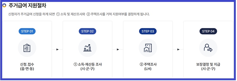 신청자가 주거급여를 신청하게 되면 소득 및 재산조사와 주택조사를 거쳐서 지원여부를 결정하게 됩니다.