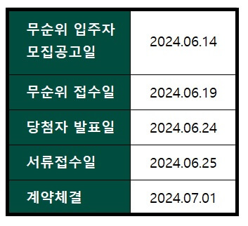 아래의 일정으로 청약이 진행됩니다. 6.19일이 청약일이고 6.24일이 발표일, 계약일이 7월 1일입니다.