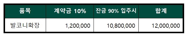 발코니확장비도 계약금 10%와 잔금 90%로 진행됩니다.