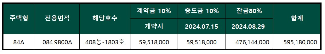 계약금 10%, 중도금 10%, 잔금 80%로 진행되며 해당 호수는 408동 1803호로 층도 좋습니다.